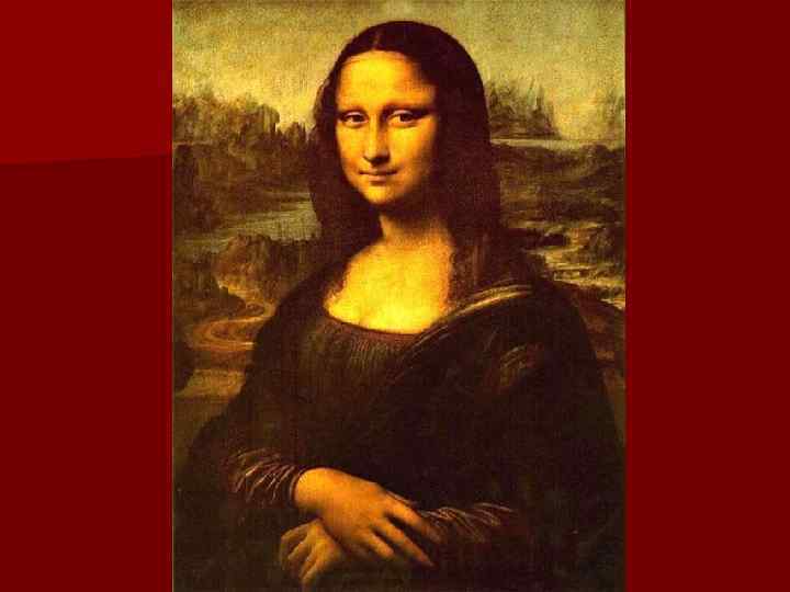 Мона Лиза. n Мона Лиза – самое известное произведение Леонардо да Винчи (1503– 1506, Лувр, Париж). Мона Лиза (сокращение от мадонна Лиза) была третьей женой флорентийского купца Франческо ди Бартоломео деле Джокондо. Теперь картина немного изменена: первоначально слева и справа были нарисованы колонны, теперь отрезанные. Небольшая по размерам картина производит монументальное впечатление: Мона Лиза показана на фоне пейзажа, где глубина пространства, воздушная дымка переданы с величайшим совершенством. Знаменитая техника сфумато Леонардо здесь доведена до небывалых вершин: тончайшая, точно тающая, дымка светотени, окутывая фигуру, смягчает контуры и тени. Есть что-то неуловимое, завораживающее и притягивающее в легкой улыбке, в живости выражения лица, в величавом спокойствии позы, в неподвижности плавных линий рук.