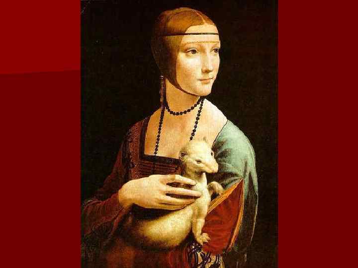 Дама с горностаем. n Дама с горностаем (1484, Музей Чарторыйского, Краков) – одна из первых работ Леонардо в качестве придворного портретиста. На картине изображена фаворитка Лодовика Цецилия Галлерани с эмблемой рода Сфорца, горностаем. Сложный поворот головы и изысканный изгиб руки дамы, изогнутая поза зверька – все говорит об авторстве Леонардо. Фон переписан другим художником.