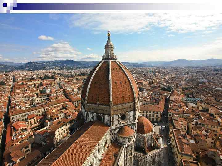 Архитектура n Главное, чем характеризуется эта эпоха – возвращение в архитектуре к принципам и формам античного искусства. Особенное значение в этом направлении придаётся симметрии, пропорции, геометрии и порядку составных частей. Наибольший расцвет Ренессансная архитектура пережила в Италии, оставив после себя два городапамятника: Флоренцию и Венецию. Собор Санта Мария дель Фьоре во Флоренции