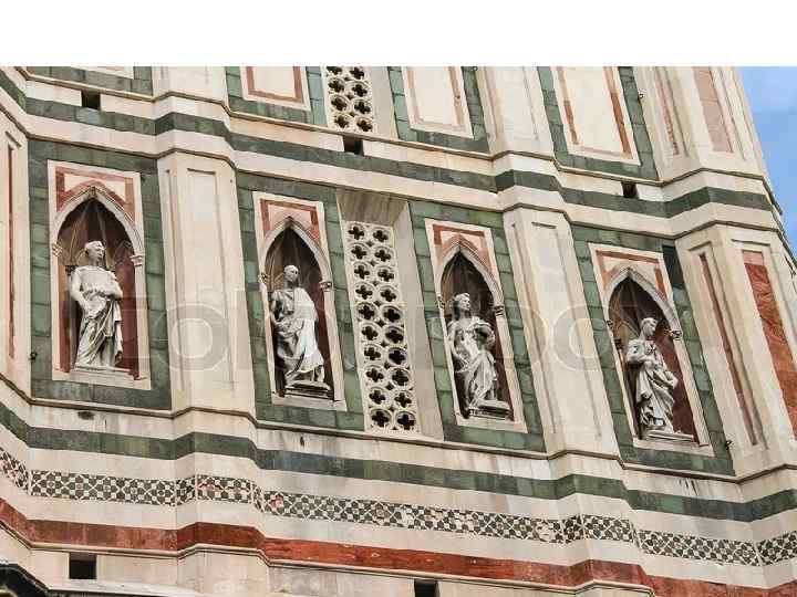 В 1334 г. по проекту Джотто было начато строительство колокольни собора, так называемой кампанилы — стройной прямоугольной башни с поэтажными горизонтальными членениями и красивыми готическими окнами, стрельчатая арочная форма которых еще долго сохранялась в итальянской архитектуре.