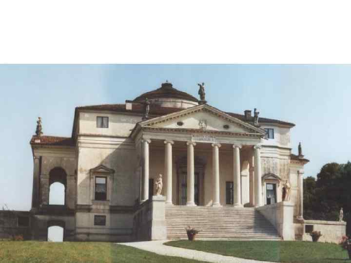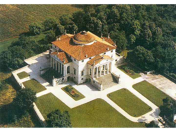Вилла Ротонда (Вилла Капра) в Виченце Вилла расположена на вершине холма, откуда во все стороны открывается красивые виды. Стремление к соразмерности и симметрии, характерное для многих произведений Палладио, определяет план всего здания и каждого из его фасадов. Правильные формы и строгая композиционная симметрия придают законченный вид зданию. Палладио не уделял большого внимания парковой архитектуре. Его виллы не утопают в зелени, а господствуют над окружающим ансамблем и подчиняют его себе.