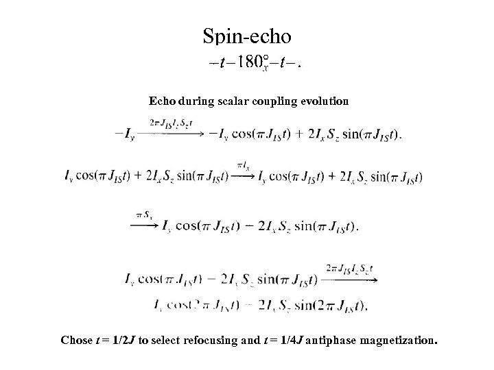 Spin-echo Echo during scalar coupling evolution Chose t = 1/2 J to select refocusing and t = 1/4 J antiphase magnetization.