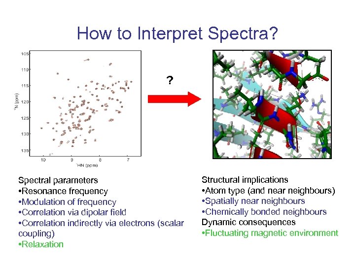 How to Interpret Spectra? ? Spectral parameters • Resonance frequency • Modulation of frequency • Correlation via dipolar field • Correlation indirectly via electrons (scalar coupling) • Relaxation Structural implications • Atom type (and near neighbours) • Spatially near neighbours • Chemically bonded neighbours Dynamic consequences • Fluctuating magnetic environment