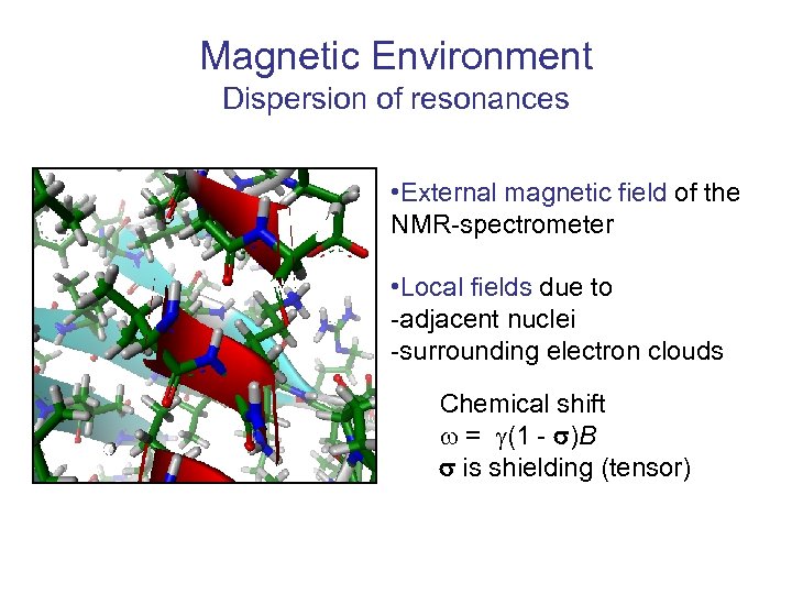 Magnetic Environment Dispersion of resonances • External magnetic field of the NMR-spectrometer • Local fields due to -adjacent nuclei -surrounding electron clouds Chemical shift w = g(1 - s)B s is shielding (tensor)