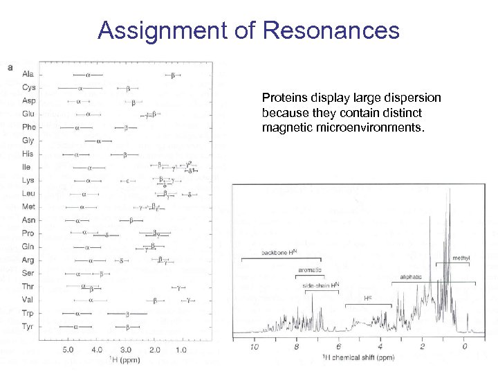 Assignment of Resonances Proteins display large dispersion because they contain distinct magnetic microenvironments.