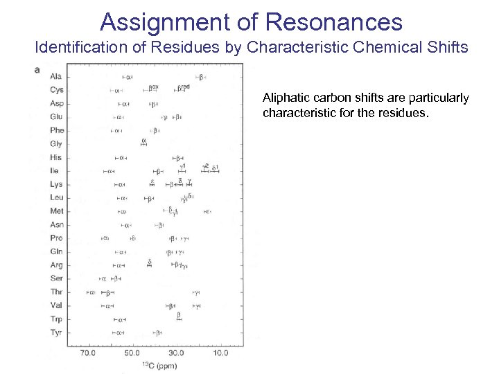 Assignment of Resonances Identification of Residues by Characteristic Chemical Shifts Aliphatic carbon shifts are particularly characteristic for the residues.