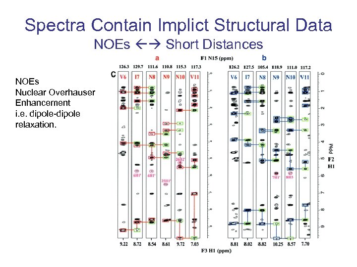 Spectra Contain Implict Structural Data NOEs Short Distances NOEs Nuclear Overhauser Enhancement i. e. dipole-dipole relaxation.