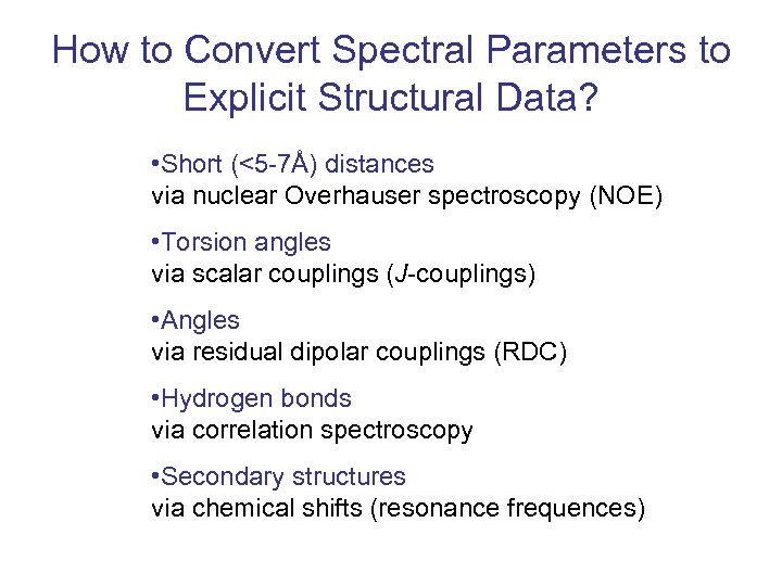How to Convert Spectral Parameters to Explicit Structural Data? • Short (<5 -7Å) distances via nuclear Overhauser spectroscopy (NOE) • Torsion angles via scalar couplings (J-couplings) • Angles via residual dipolar couplings (RDC) • Hydrogen bonds via correlation spectroscopy • Secondary structures via chemical shifts (resonance frequences)