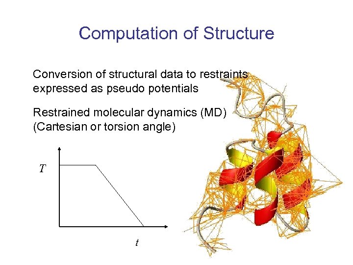 Computation of Structure Conversion of structural data to restraints expressed as pseudo potentials Restrained molecular dynamics (MD) (Cartesian or torsion angle) T t