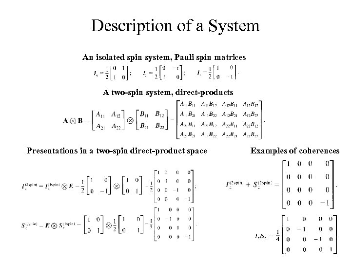 Description of a System An isolated spin system, Pauli spin matrices A two-spin system, direct-products Presentations in a two-spin direct-product space Examples of coherences