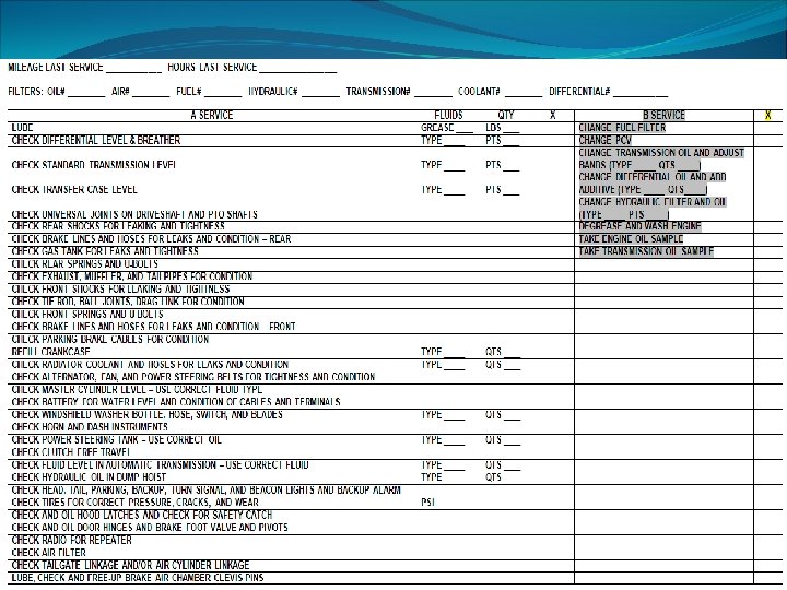 PM Program • Levels Of PMs • Frequency – follow manufacturer’s recommended intervals • Management System • Documentation • PM Compliance – 95% • Oil Sampling • Target 70% PM or scheduled maintenance – 30% unscheduled