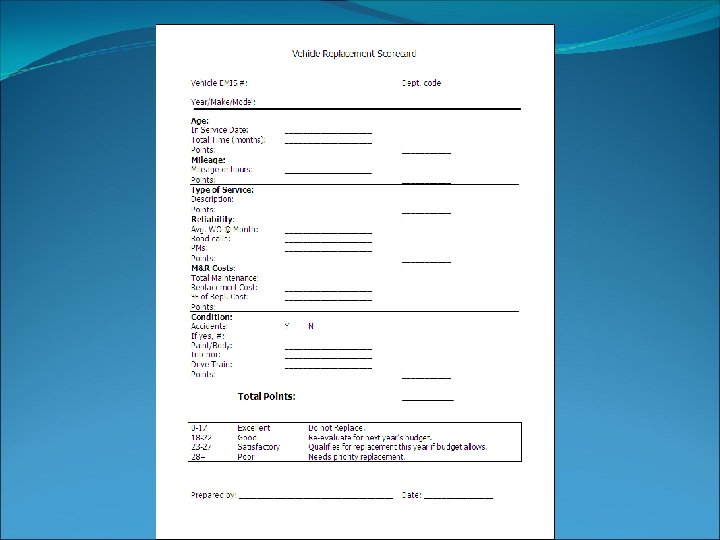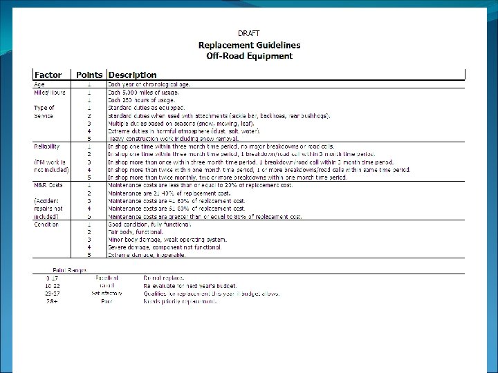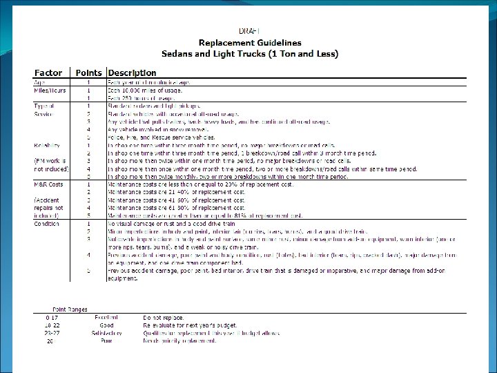 Funding/Budget • Replacement Funds • Utilization • Justify the Need • Defend Replacement Budget • Replacement Budget as a Guideline • Re-evaluate Fleet and Equipment Composition