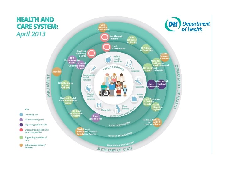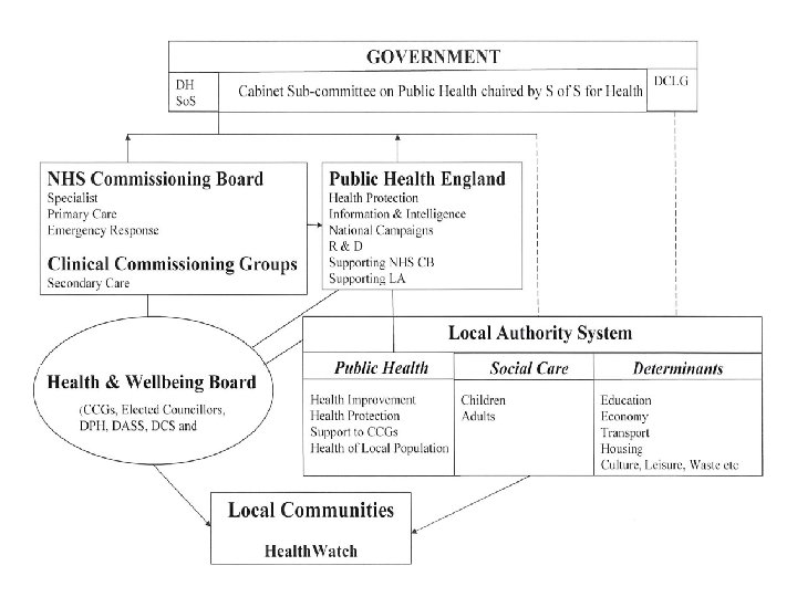 The Health and Care landscape in 2013 S of S and DH Local Government NHS CB PH (England) Health & Well-being Board JSNA to H&WB strategy to Commissioning Plans PH in LA Health. Watch Communities O&SC CCG