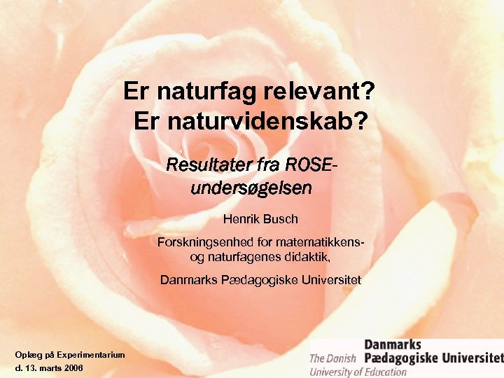 Er naturfag relevant? Er naturvidenskab? Resultater fra ROSEundersøgelsen Henrik Busch Forskningsenhed for matematikkensog naturfagenes didaktik, Danmarks Pædagogiske Universitet Oplæg på Experimentarium d. 13. marts 2006