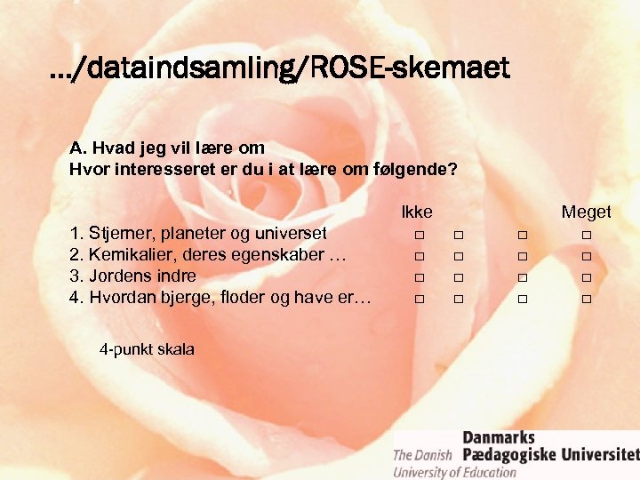 …/dataindsamling/ROSE-skemaet A. Hvad jeg vil lære om Hvor interesseret er du i at lære om følgende? 1. Stjerner, planeter og universet 2. Kemikalier, deres egenskaber … 3. Jordens indre 4. Hvordan bjerge, floder og have er… 4 -punkt skala Ikke □ □ □ □ □ Meget □ □