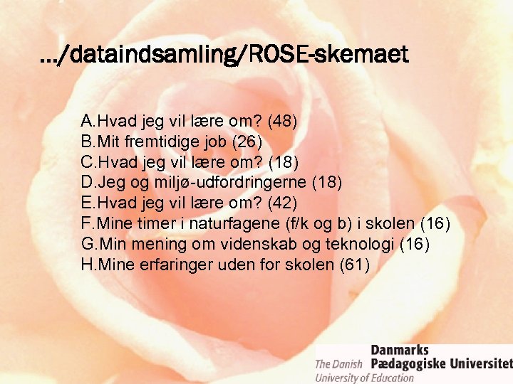 …/dataindsamling/ROSE-skemaet A. Hvad jeg vil lære om? (48) B. Mit fremtidige job (26) C. Hvad jeg vil lære om? (18) D. Jeg og miljø-udfordringerne (18) E. Hvad jeg vil lære om? (42) F. Mine timer i naturfagene (f/k og b) i skolen (16) G. Min mening om videnskab og teknologi (16) H. Mine erfaringer uden for skolen (61)
