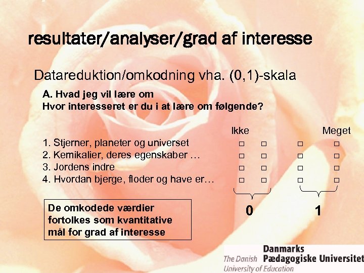 resultater/analyser/grad af interesse Datareduktion/omkodning vha. (0, 1)-skala A. Hvad jeg vil lære om Hvor interesseret er du i at lære om følgende? 1. Stjerner, planeter og universet 2. Kemikalier, deres egenskaber … 3. Jordens indre 4. Hvordan bjerge, floder og have er… De omkodede værdier fortolkes som kvantitative mål for grad af interesse Ikke □ □ 0 □ □ □ □ Meget □ □ 1