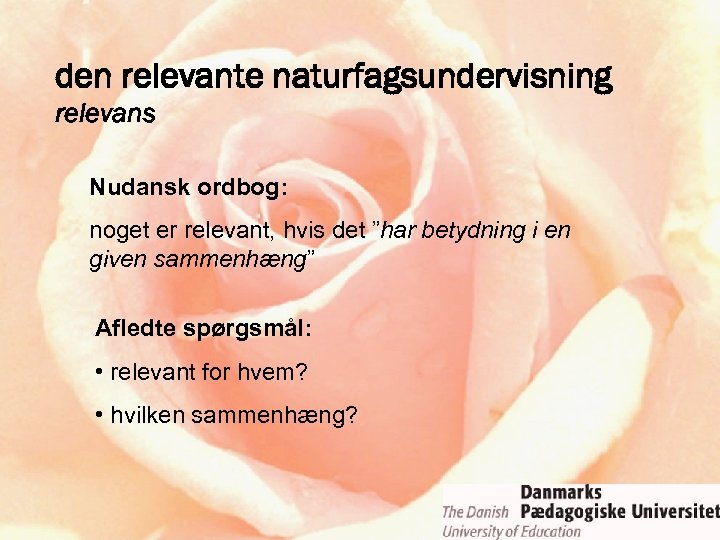 den relevante naturfagsundervisning relevans Nudansk ordbog: noget er relevant, hvis det ”har betydning i en given sammenhæng” Afledte spørgsmål: • relevant for hvem? • hvilken sammenhæng?