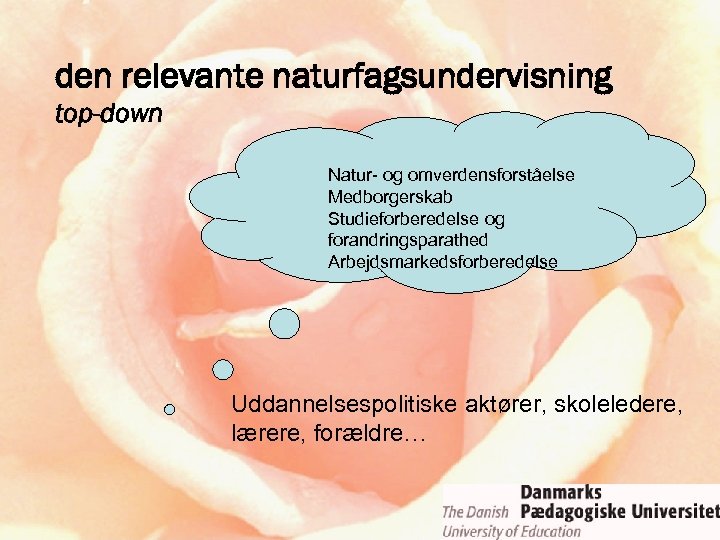 den relevante naturfagsundervisning top-down Natur- og omverdensforståelse Medborgerskab Studieforberedelse og forandringsparathed Arbejdsmarkedsforberedelse Uddannelsespolitiske aktører, skoleledere, lærere, forældre…