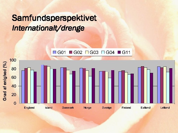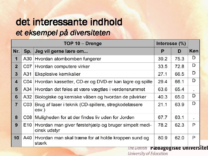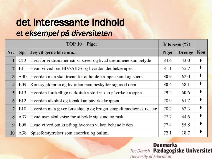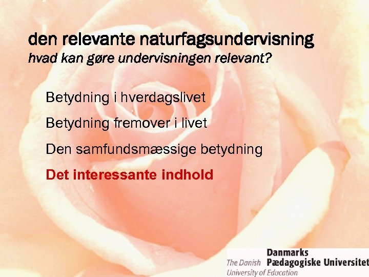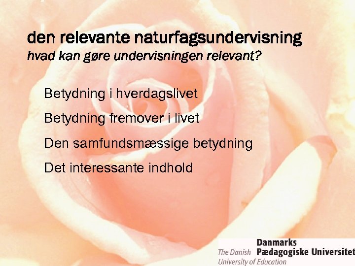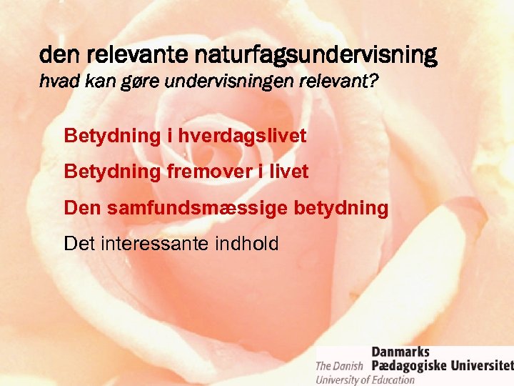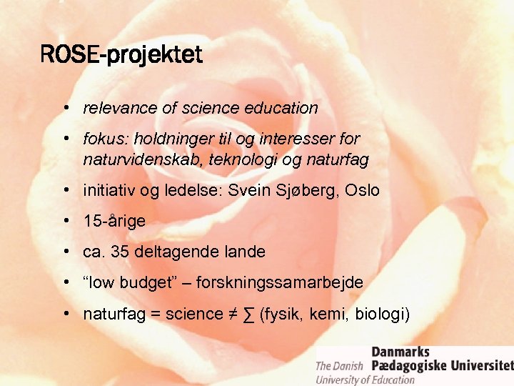 ROSE-projektet • relevance of science education • fokus: holdninger til og interesser for naturvidenskab, teknologi og naturfag • initiativ og ledelse: Svein Sjøberg, Oslo • 15 -årige • ca. 35 deltagende lande • “low budget” – forskningssamarbejde • naturfag = science ≠ ∑ (fysik, kemi, biologi)