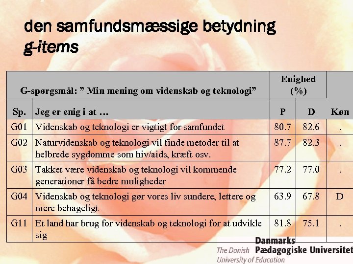 den samfundsmæssige betydning g-items G-spørgsmål: ” Min mening om videnskab og teknologi” Sp. Jeg er enig i at … Enighed (%) P D Køn G 01 Videnskab og teknologi er vigtigt for samfundet 80. 7 82. 6 . G 02 Naturvidenskab og teknologi vil finde metoder til at helbrede sygdomme som hiv/aids, kræft osv. 87. 7 82. 3 . G 03 Takket være videnskab og teknologi vil kommende generationer få bedre muligheder 77. 2 77. 0 . G 04 Videnskab og teknologi gør vores liv sundere, lettere og mere behageligt 63. 9 67. 8 D G 11 Et land har brug for videnskab og teknologi for at udvikle sig 81. 8 75. 1 .