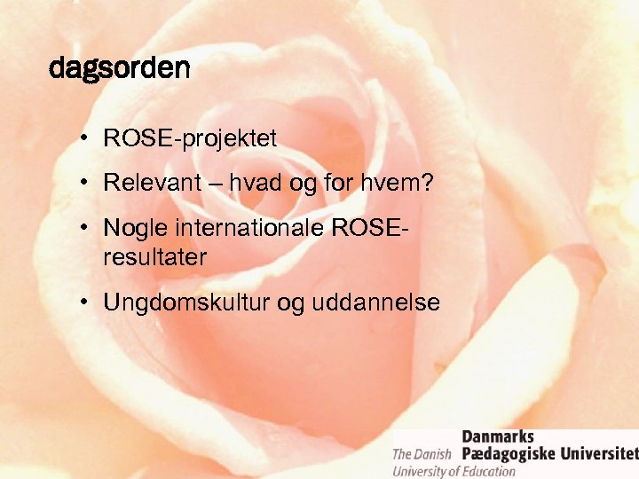 dagsorden • ROSE-projektet • Relevant – hvad og for hvem? • Nogle internationale ROSEresultater • Ungdomskultur og uddannelse