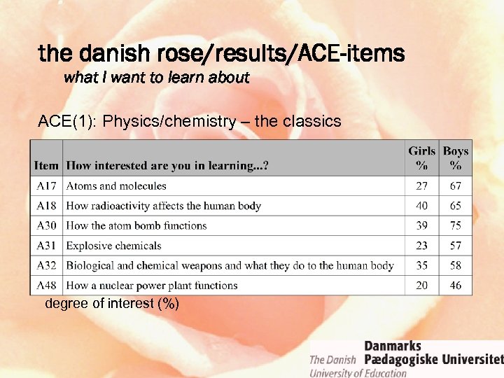 the danish rose/results/ACE-items what I want to learn about ACE(1): Physics/chemistry – the classics degree of interest (%)