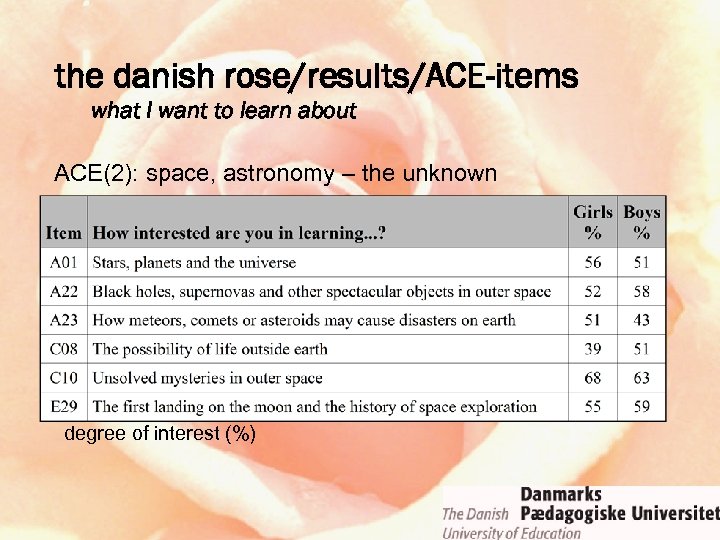 the danish rose/results/ACE-items what I want to learn about ACE(2): space, astronomy – the unknown degree of interest (%)