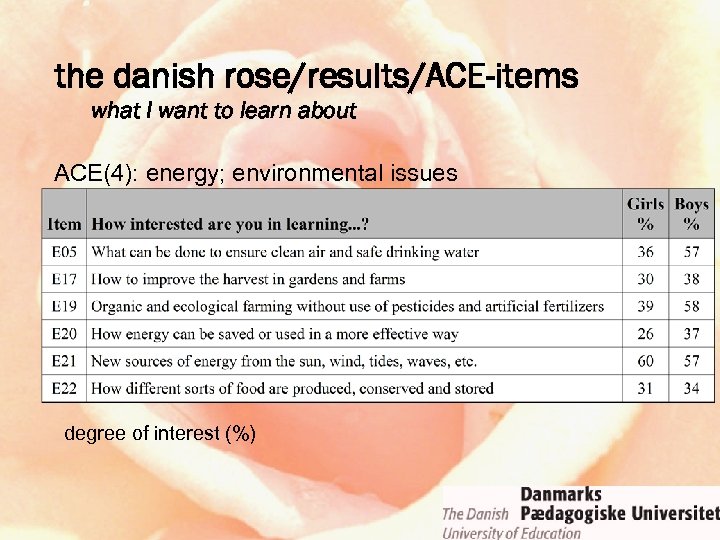 the danish rose/results/ACE-items what I want to learn about ACE(4): energy; environmental issues degree of interest (%)