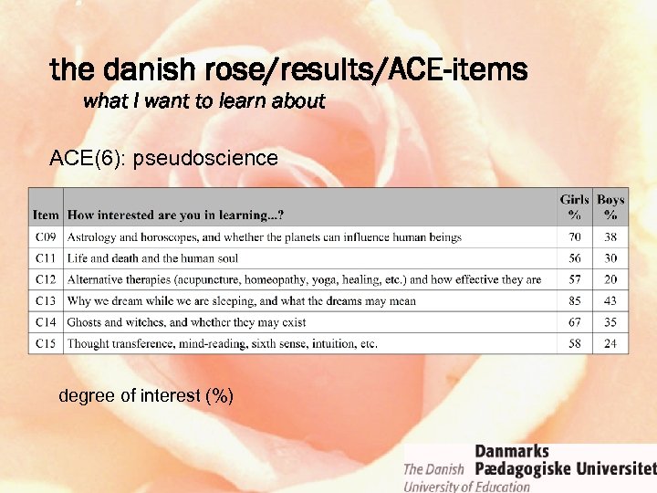 the danish rose/results/ACE-items what I want to learn about ACE(6): pseudoscience degree of interest (%)
