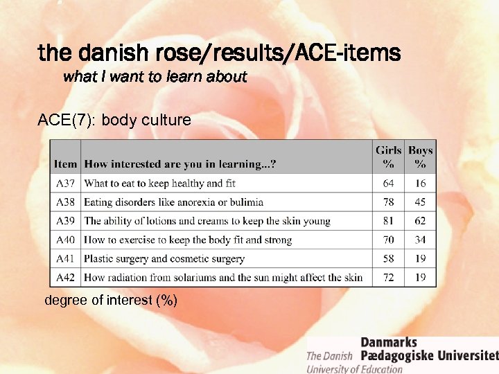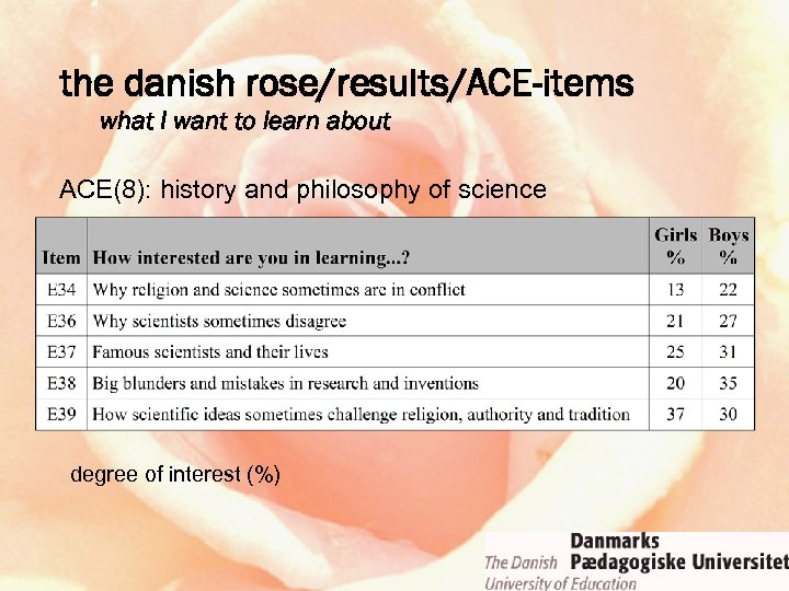 the danish rose/results/ACE-items what I want to learn about ACE(5): technology – inside the black box degree of interest (%)