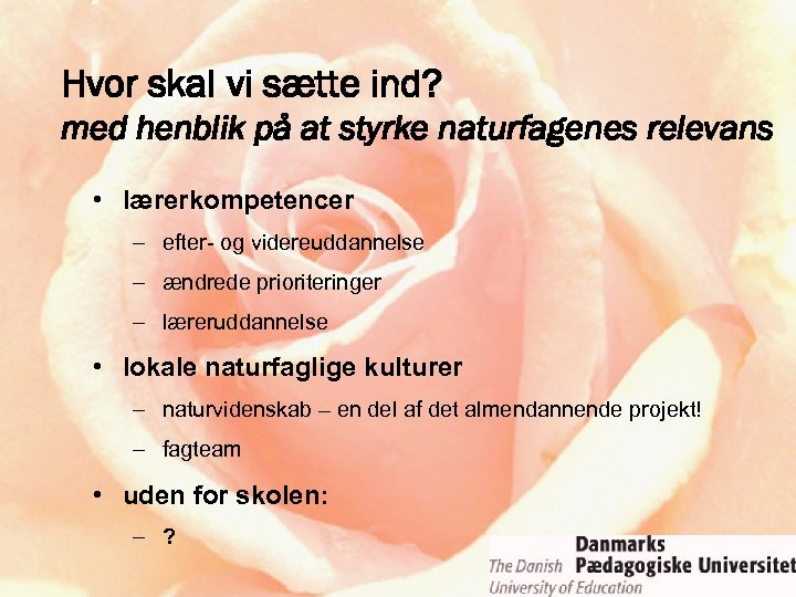 Hvor skal vi sætte ind? med henblik på at styrke naturfagenes relevans • lærerkompetencer – efter- og videreuddannelse – ændrede prioriteringer – læreruddannelse • lokale naturfaglige kulturer – naturvidenskab – en del af det almendannende projekt! – fagteam • uden for skolen: – ?