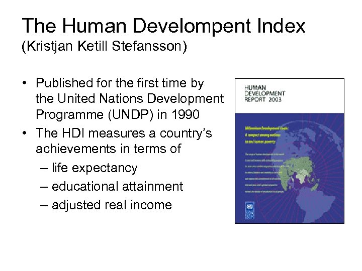 The Human Develompent Index (Kristjan Ketill Stefansson) • Published for the first time by the United Nations Development Programme (UNDP) in 1990 • The HDI measures a country’s achievements in terms of – life expectancy – educational attainment – adjusted real income