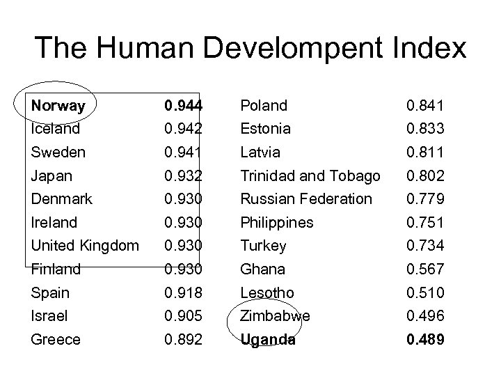 The Human Develompent Index Norway 0. 944 Poland 0. 841 Iceland 0. 942 Estonia 0. 833 Sweden 0. 941 Latvia 0. 811 Japan 0. 932 Trinidad and Tobago 0. 802 Denmark 0. 930 Russian Federation 0. 779 Ireland 0. 930 Philippines 0. 751 United Kingdom 0. 930 Turkey 0. 734 Finland 0. 930 Ghana 0. 567 Spain 0. 918 Lesotho 0. 510 Israel 0. 905 Zimbabwe 0. 496 Greece 0. 892 Uganda 0. 489