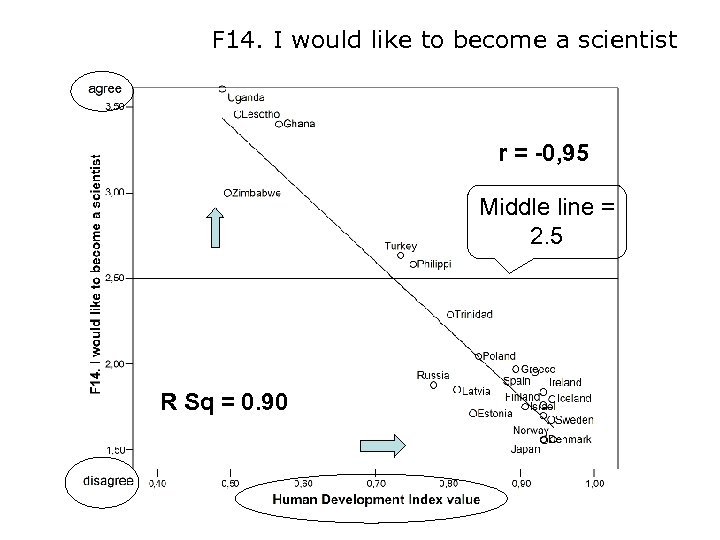 F 14. I would like to become a scientist r = -0, 95 Middle line = 2. 5 R Sq = 0. 90
