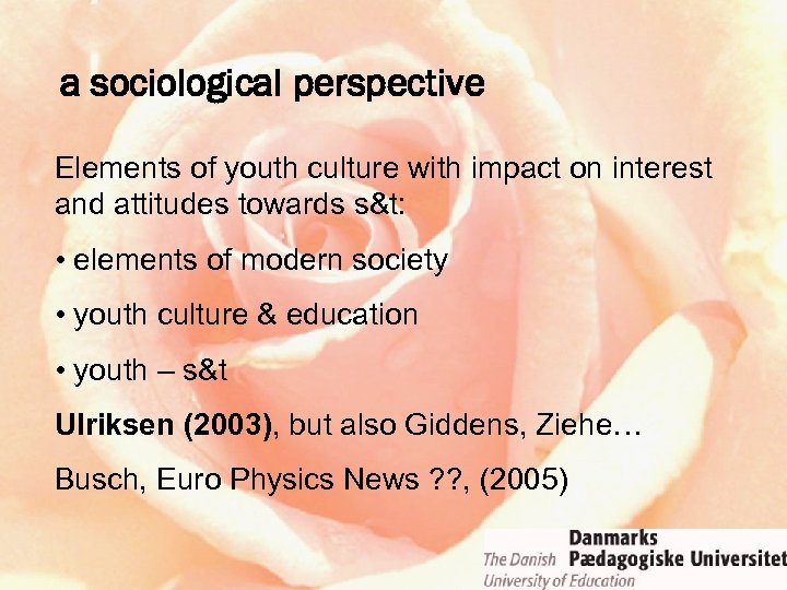 a sociological perspective Elements of youth culture with impact on interest and attitudes towards s&t: • elements of modern society • youth culture & education • youth – s&t Ulriksen (2003), but also Giddens, Ziehe… Busch, Euro Physics News ? ? , (2005)