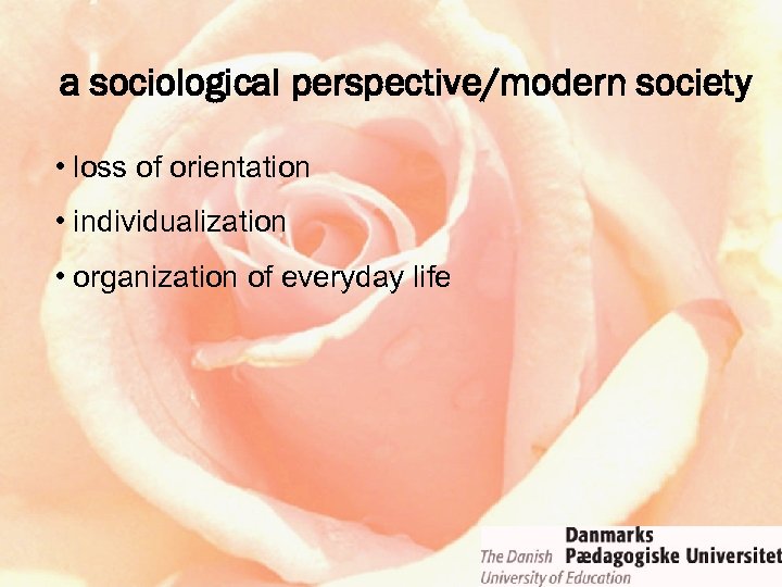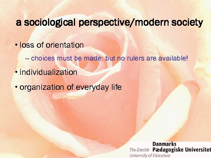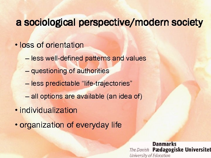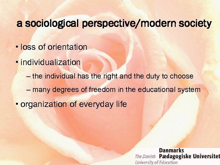 a sociological perspective/modern society • loss of orientation • individualization – the individual has the right and the duty to choose – many degrees of freedom in the educational system • organization of everyday life