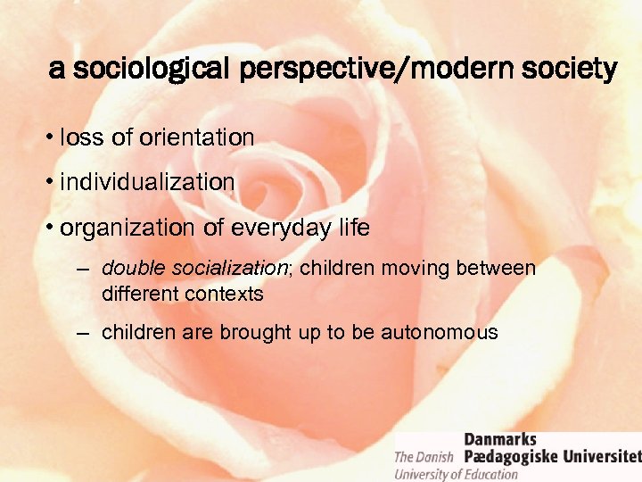 a sociological perspective/modern society • loss of orientation • individualization • organization of everyday life – double socialization; children moving between different contexts – children are brought up to be autonomous