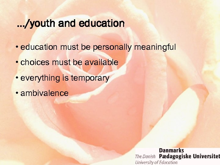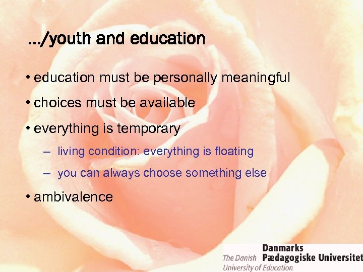 …/youth and education • education must be personally meaningful • choices must be available • everything is temporary – living condition: everything is floating – you can always choose something else • ambivalence