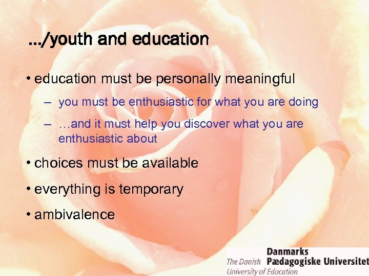 …/youth and education • education must be personally meaningful – you must be enthusiastic for what you are doing – …and it must help you discover what you are enthusiastic about • choices must be available • everything is temporary • ambivalence