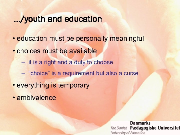 …/youth and education • education must be personally meaningful • choices must be available – it is a right and a duty to choose – “choice” is a requirement but also a curse • everything is temporary • ambivalence