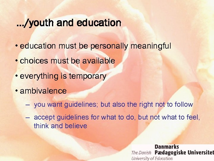 …/youth and education • education must be personally meaningful • choices must be available • everything is temporary • ambivalence – you want guidelines; but also the right not to follow – accept guidelines for what to do, but not what to feel, think and believe