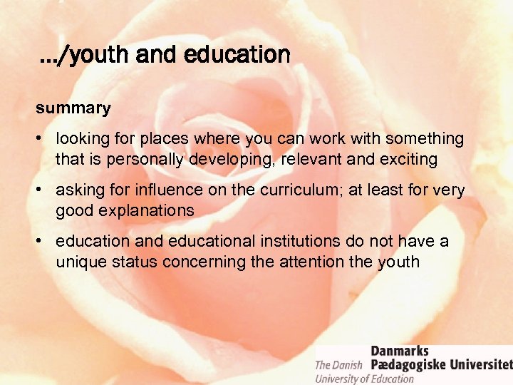 …/youth and education summary • looking for places where you can work with something that is personally developing, relevant and exciting • asking for influence on the curriculum; at least for very good explanations • education and educational institutions do not have a unique status concerning the attention the youth