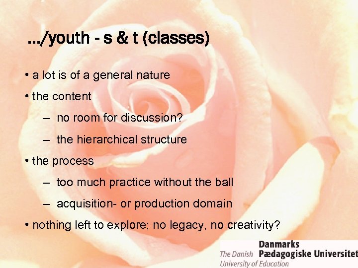 …/youth - s & t (classes) • a lot is of a general nature • the content – no room for discussion? – the hierarchical structure • the process – too much practice without the ball – acquisition- or production domain • nothing left to explore; no legacy, no creativity?