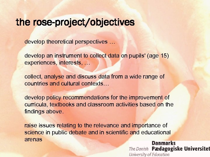 the rose-project/objectives develop theoretical perspectives … develop an instrument to collect data on pupils' (age 15) experiences, interests, … collect, analyse and discuss data from a wide range of countries and cultural contexts… develop policy recommendations for the improvement of curricula, textbooks and classroom activities based on the findings above. raise issues relating to the relevance and importance of science in public debate and in scientific and educational arenas