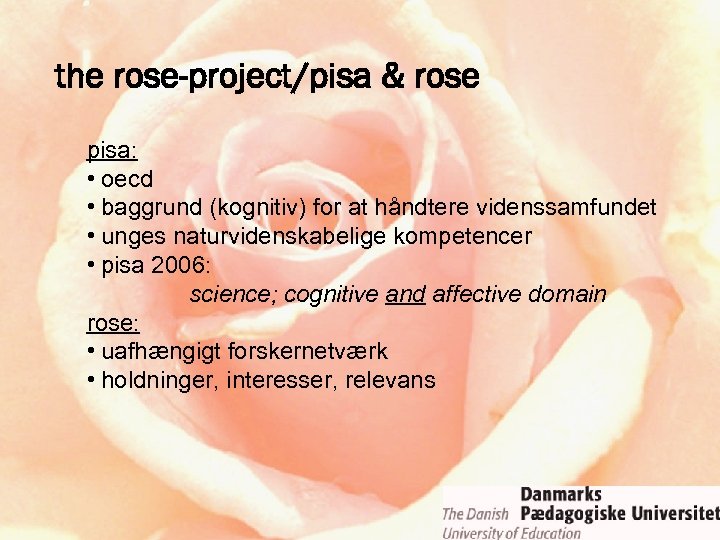 the rose-project/pisa & rose pisa: • oecd • baggrund (kognitiv) for at håndtere videnssamfundet • unges naturvidenskabelige kompetencer • pisa 2006: science; cognitive and affective domain rose: • uafhængigt forskernetværk • holdninger, interesser, relevans