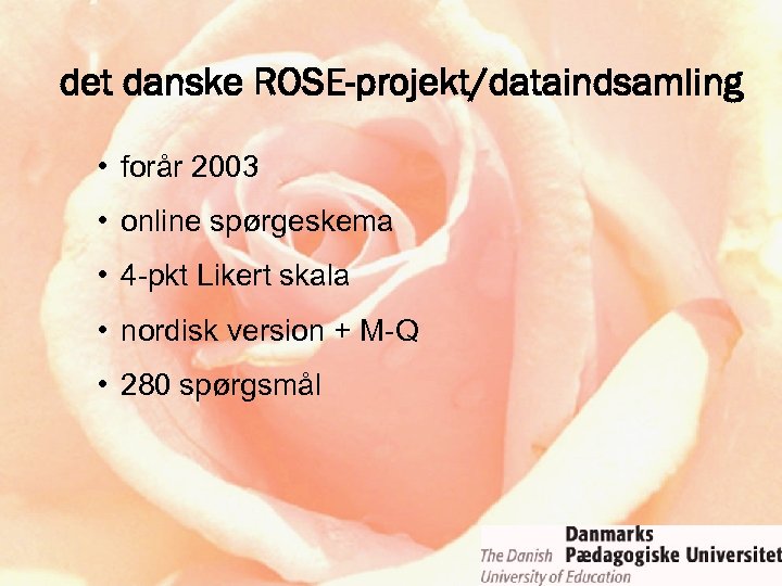 det danske ROSE-projekt/dataindsamling • forår 2003 • online spørgeskema • 4 -pkt Likert skala • nordisk version + M-Q • 280 spørgsmål