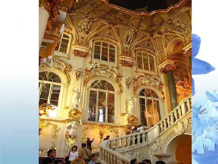ПАРАДНАЯ ЛЕСТНИЦА ЗИМНЕГО ДВОРЦА Парадная лестница Зимнего дворца была восстановлена после пожара 1837 г. В. П. Стасовым, сохранившим в общих чертах замысел Ф. Б. Растрелли. Два широких мраморных марша ведут на площадку, где установлены колонны из серого гранита. Плафон с изображением Олимпа визуально увеличивает высоту интерьера, пронизанного светом, сверкающего позолотой и зеркалами. Лестницу украшают статуи, часть которых была привезена при Петре I из Италии. В XVIII в. лестницу называли Посольской, позже - Иорданской, так как по ней во время праздника Крещения спускался крестный ход к Неве.