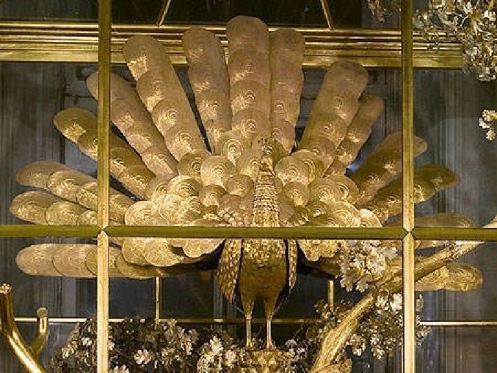 Изготовлены часы были на берегу туманного Альбиона великим мастером Джеймсом Коксом, поступили в Россию в полностью разобранном виде и, если бы не знаменитый русский механик Кулибин, так и погибли. Но судьба улыбнулась изделию и Иван Петрович сумел разобраться в хитросплетениях механизма. Пьедесталом для восточного павлина служит дубовый пенек с кудрявой веткой, поднявшейся над ним на высоту более двух с половиной метров. К дубу прикреплен сухой сук, а к нему подвешена на шнуре шарообразная клетка. В ней сидит сделанная из темного серебра сова, а под клеткой расположилась белка. К другой стороне пня приделана еще одна ветка, рядом с которой стоит петух. Основание самих часов — круглое и посеребренное. На передней части клумбы-основания стоят шесть грибов: на шляпке самого большого из них, в прорезе, появляются римские цифры (часы) и арабские цифры (минуты). Бег секунд отмечает кузнечик, кружащийся над грибной шляпкой. Другие грибы, а также желуди и листья скрывают отверстия для завода механизмов. За пнем спрятаны тыквы, на дереве и на земле видны улитки, ящерицы и две маленькие белки, а еще здесь есть лягушка и змея. Когда механизм часов заведен, то скрытые в их основании колокольчики начинают отбивать четверти и часы, а в определенное время шевелятся фигурки птиц. Первой оживает сова: ее клетка вращается, звеня укрепленными на ней колокольчиками. Сова вертит головой, хлопает глазами, одна лапа ее то опускается, то поднимается. Когда затихает музыка и замирают движения совы, с легким шумом распускается великолепный павлиний хвост. Павлин быстро поворачивается, а когда хвост опускается, павлин возвращается в первоначальное положение. Последним, хрипло кукарекая, пробуждается петух. Так работают эти замечательные часы, и в Павильонный зал Эрмитажа, чтобы полюбоваться ими, всегда приходит много народа.