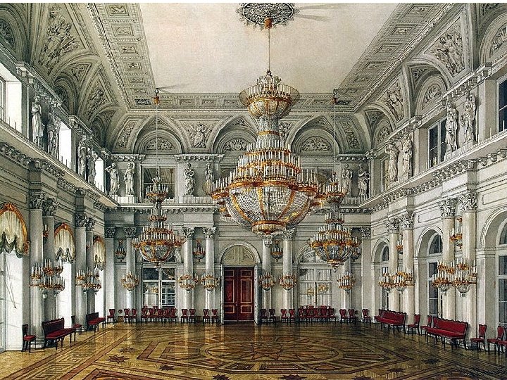ПЕТРОВСКИЙ МАЛЫЙ ТРОННЫЙ ЗАЛ Петровский (Малый тронный) зал Зимнего дворца создан в 1833 году по проекту О. Монферрана. Посвящён памяти Петра I. В отделке интерьера зала использованы вензель императора (две латинские буквы «P» ), двуглавые орлы и короны. Трон изготовлен в Петербурге в конце XVIII века. За троном, в нише, оформленной в виде триумфальной арки находится картина «Петр I с богиней мудрости Минервой» . В верхней части стен помещены полотна, изображающие знаменитые сражения Северной войны — Полтавскую баталию и битву при Лесной. Зал украшают шитые серебром панно из лионского бархата и изделия из серебра. В зале также имеются царские короны, государственные гербы в виде двуглавых орлов.
